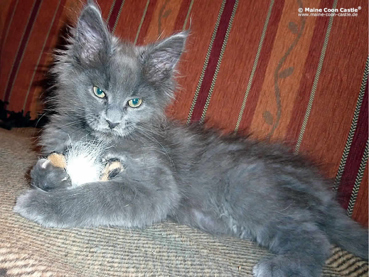 Als kleinstes Tier aus dem Maine Coon Wurf hatte Lea einiges nachzuholen. Nach ihrem Einzug bei uns hatten wir erhebliche Probleme mit ihrer Nahrungsaufnahme. King Leo hat sich von Anfang an sehr um diese kleine Katzendame bemüht.