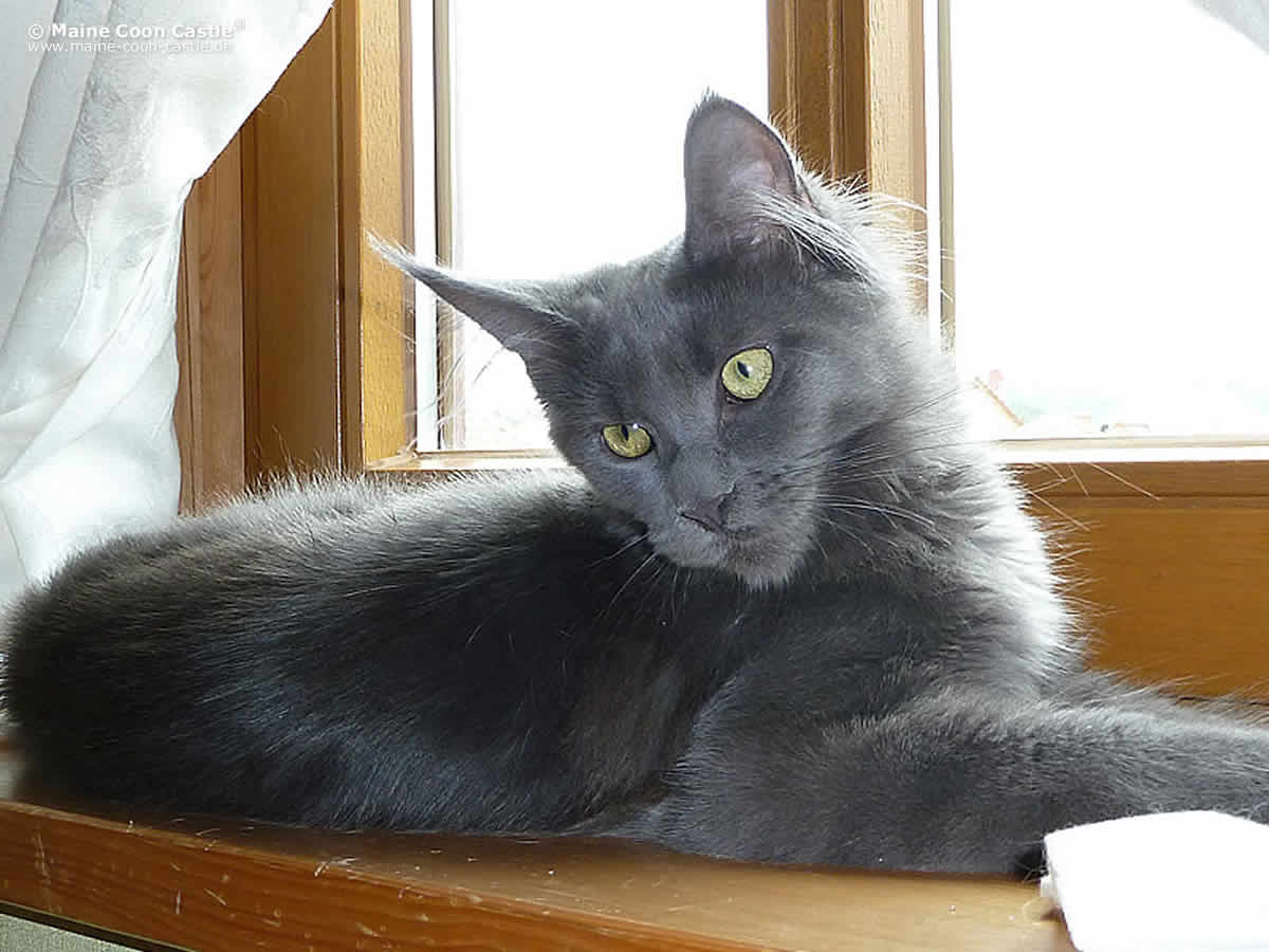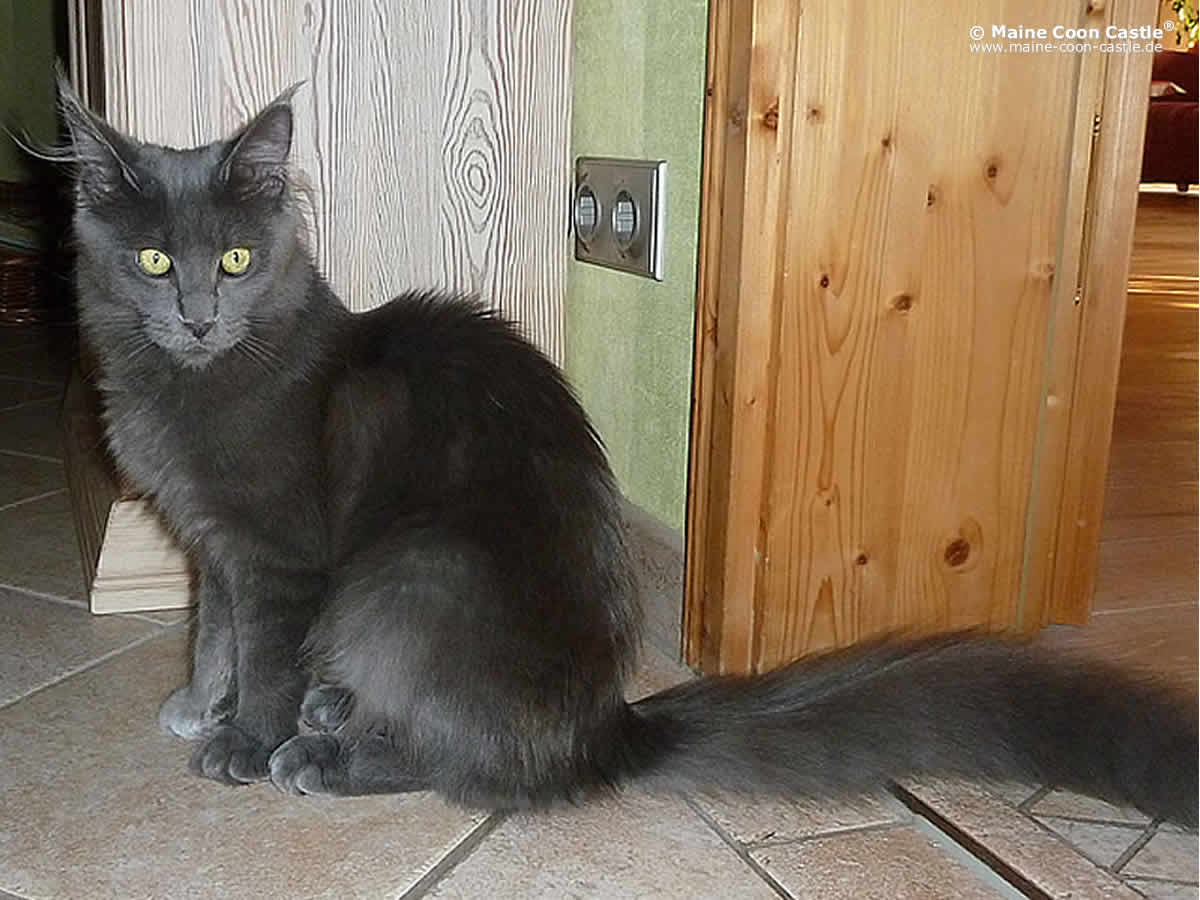 Lea hat sich zu einer liebenswerten, temperamentvollen und verschmusten Maine Coon Katze entwickelt. Lea ist sehr sozialisiert, hat einen wunderbaren Charakter und verträgt sich mit den anderen Tieren in der Gruppe sehr gut. Sie ist eine fantastische, typvolle Erscheinung mit ihrem langgestreckten Körper auf hohen Beinen. Sie hat sehr pflegeleichtes Fell, einen langen buschigen Schwanz, große toll bepinselte Ohren und eine süße Knubbelschnute. Lea ist eine sehr gutmütige, sanfte, aber nicht besonders intelligente Maine Coon, die es liebt, immer in unserer Nähe zu sein.