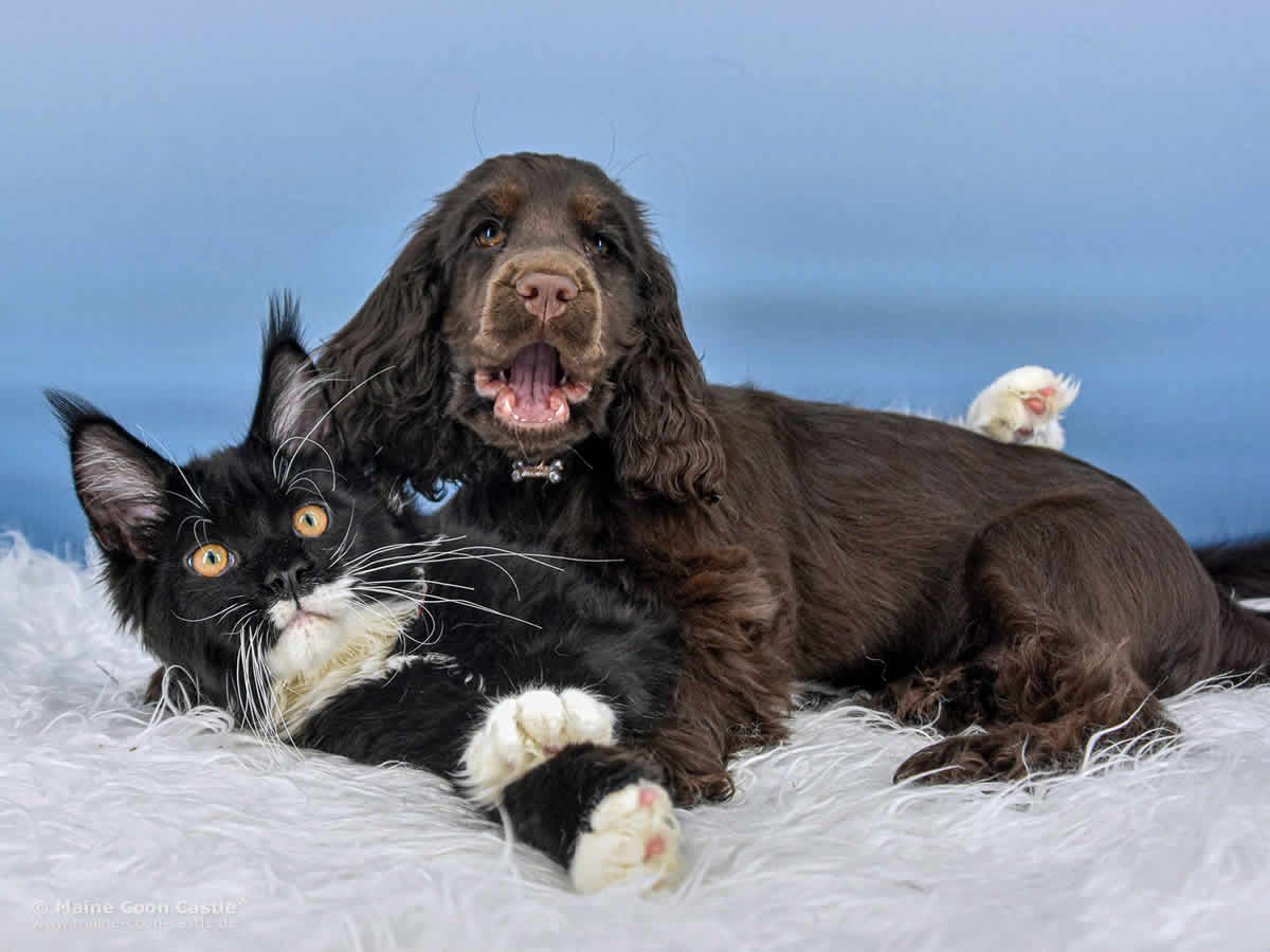 Der beste Freund von English Cocker Spaniel Charlotte ist der Maine Coon Kater Rado. Er hat ein Gemüt wie ein Schaukelpferd. Mit Rado kann sie alles machen und auch an ihm herumknabbern. Charlotte und Rado sieht man meist zusammen. Beim Spielen, beim Fressen und beim Schlafen. Charlotte nutzt ihren Freund gern als Kopfkissen.