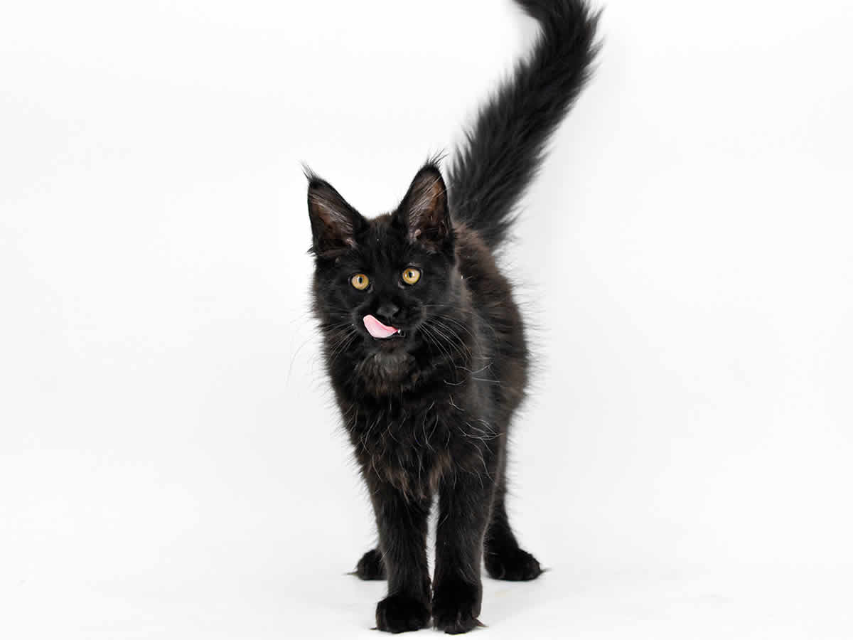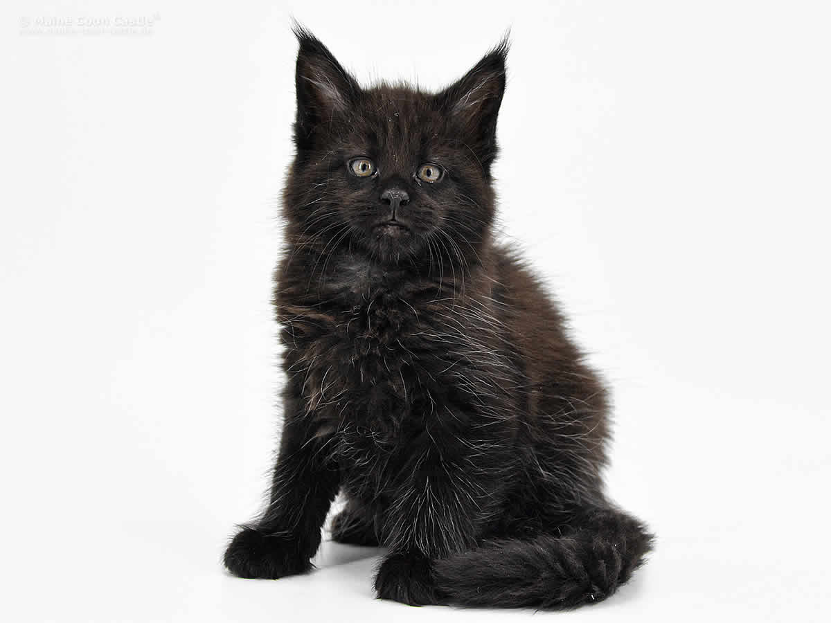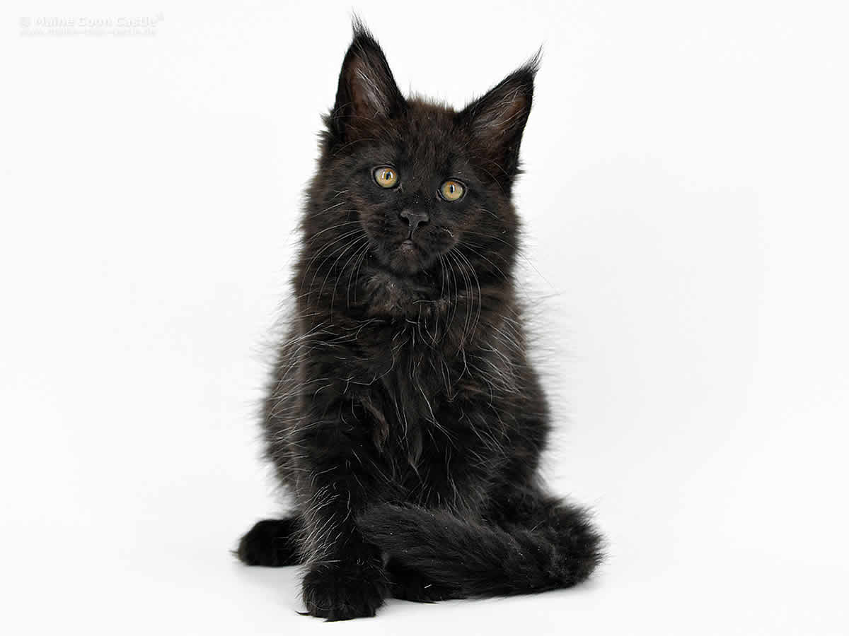 Der schwarze Panther, das Maine Coon Baby Gordie, ist ein schneller und geschickter Spielzeugjäger. Gordie of Maine Coon Castle repräsentiert eine perfekte Mischung aus den Zuchtlinien seiner Eltern. Der schwarze Schönling ist ein sehr anhänglicher Junge, der beachtet werden möchte. Gordie wird zum Kuscheln sehr gern auf den Arm genommen.