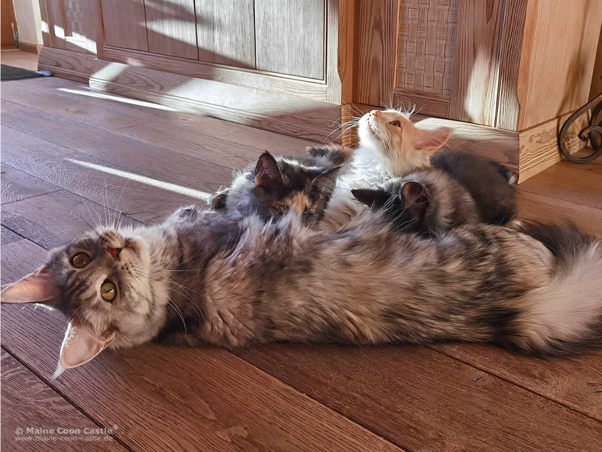 Ich bin mir nicht sicher, ob Kimy noch Milch hat und für ihre Maine Coon Babys überhaupt noch etwas zu holen ist. Offensichtlich lieben alle Kitten den engen Kontakt zu ihrer Katzenmama.