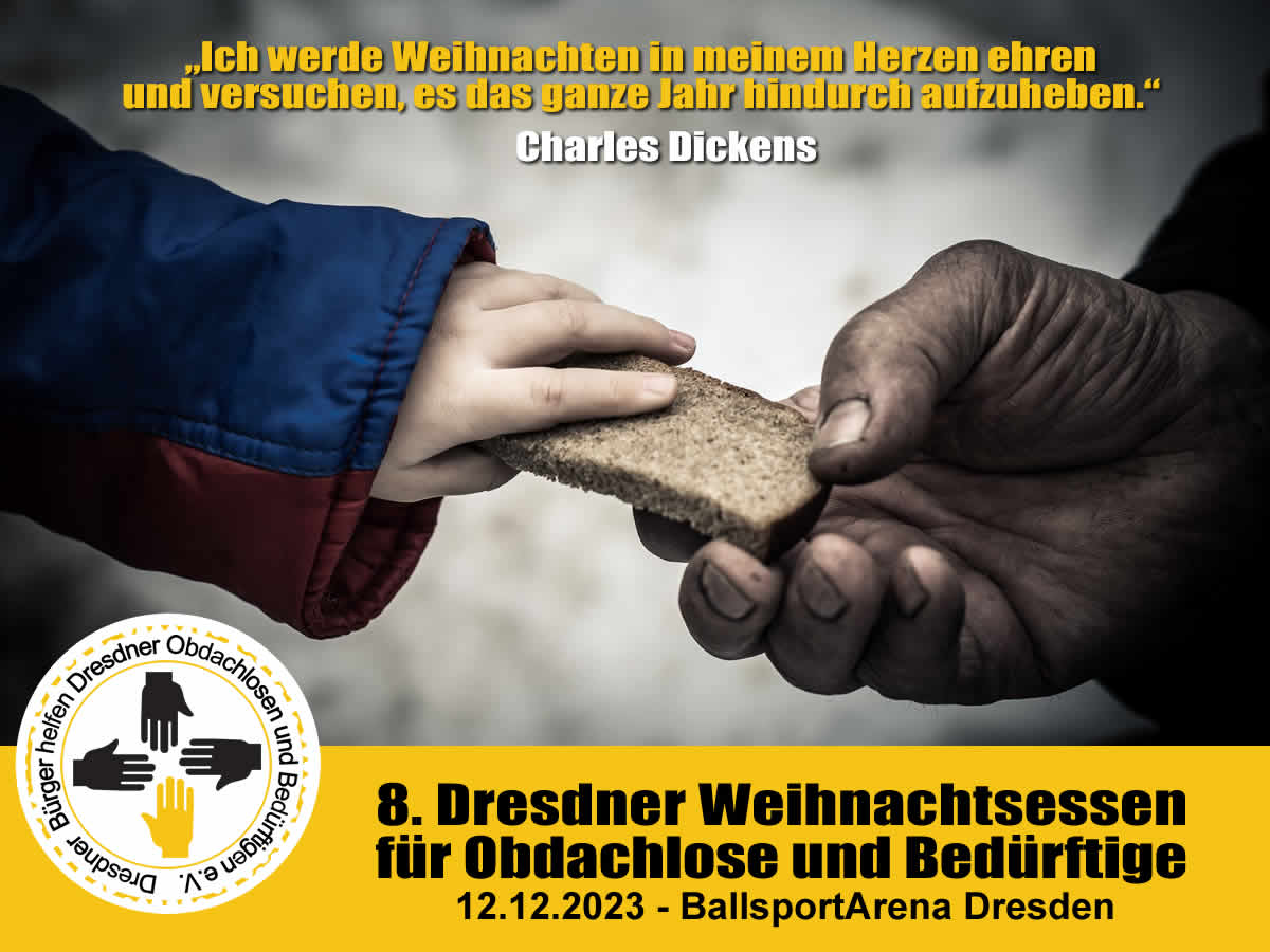 Den alljährlichen Höhepunkt unserer Arbeit bildet das Weihnachtsessen für Obdachlose und Bedürftige. Das Lachen der Kinder und die strahlenden Augen der Menschen sind dabei unser Lohn. Obdachlose und Bedürftige sind Teil unserer Gesellschaft. Deshalb! Dresdner Bürger helfen und setzen ein Zeichen für Nächstenliebe und Toleranz!