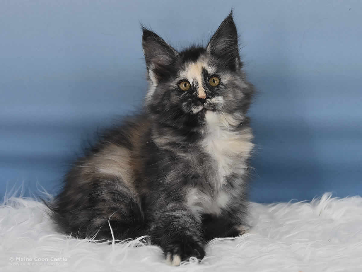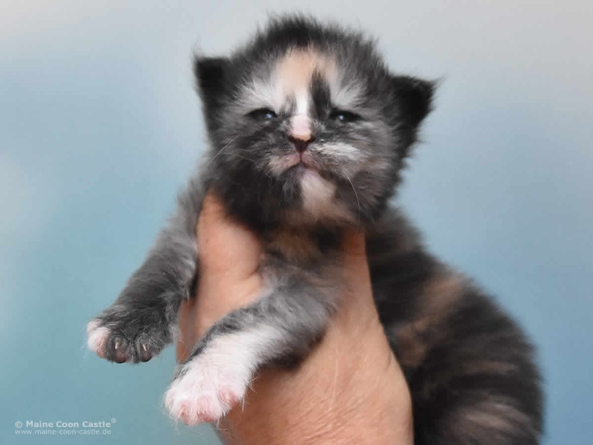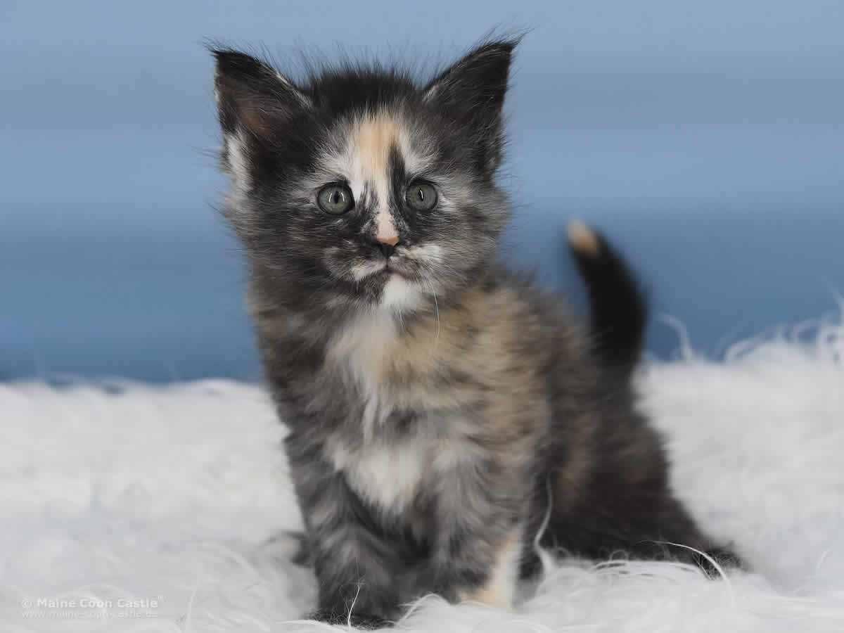 Das Maine Coon Baby Querida hat bunte Murmeln im Kopf, Hummeln im Hintern und ist ständig auf Achse. Querida spielt sehr gern und ausgelassen. Bei kleinen Kämpfen mit ihren Brüdern ist sie nicht zimperlich. Ihr recht eigener Maine Coon Look ist begeisternd. Querida möchte gern im Mittelpunkt stehen und benötigt als kleine, bunte Zicke Führung in ihrer Entwicklung.