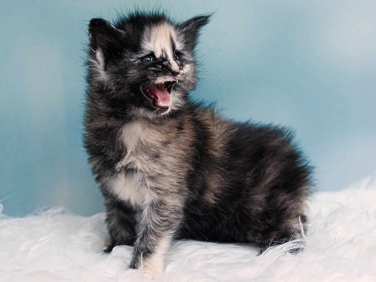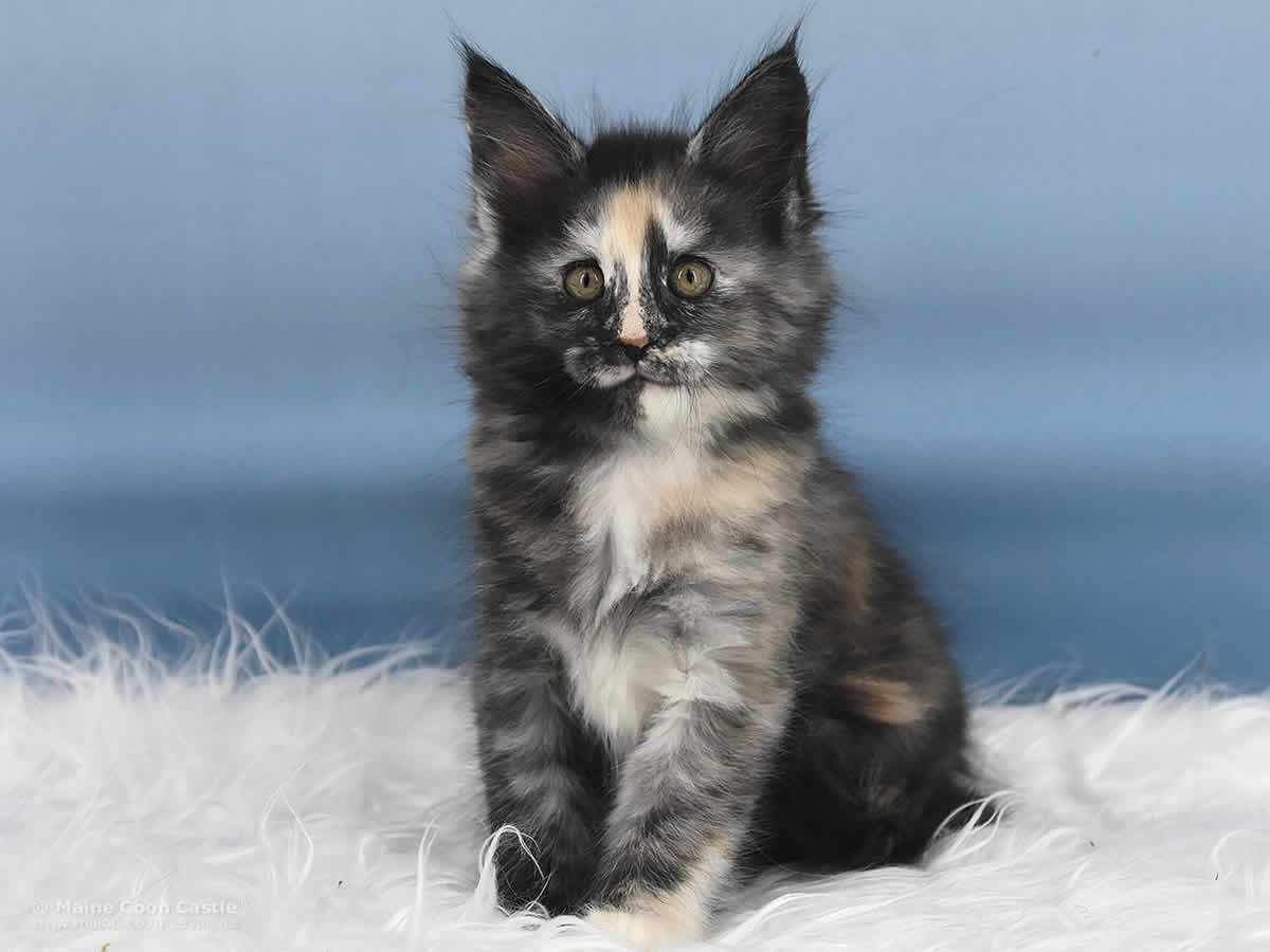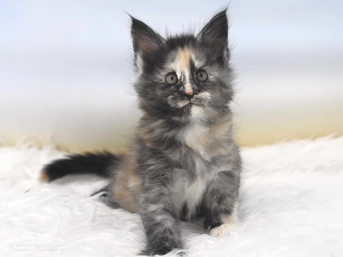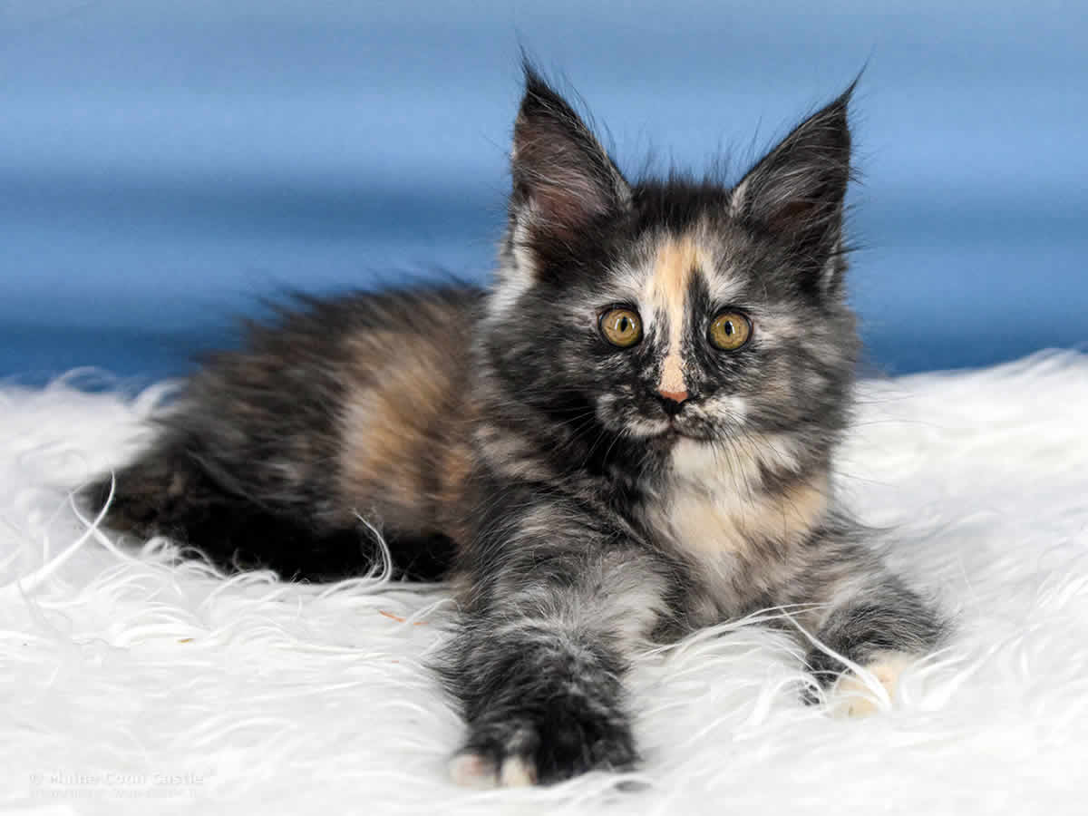 Das Maine Coon Baby Querida hat bunte Murmeln im Kopf, Hummeln im Hintern und ist ständig auf Achse. Querida spielt sehr gern und ausgelassen. Bei kleinen Kämpfen mit ihren Brüdern ist sie nicht zimperlich. Ihr recht eigener Maine Coon Look ist begeisternd. Querida möchte gern im Mittelpunkt stehen und benötigt als kleine, bunte Zicke Führung in ihrer Entwicklung.