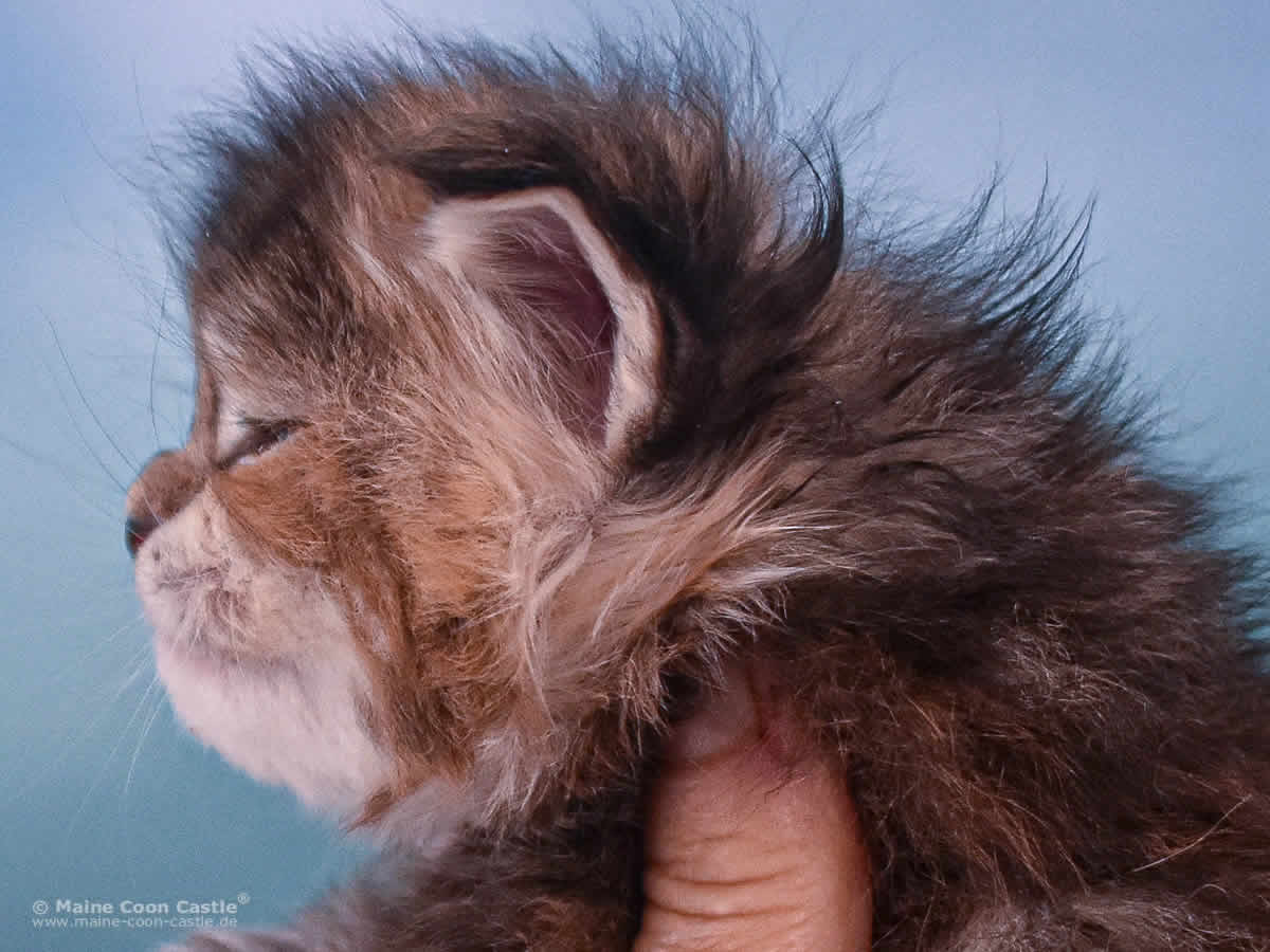 Der Adel des CastleLandes – Valentina of Maine Coon Castle. Das Maine Coon Baby entspricht makellos dem alten Typ der Katzenrasse Maine Coon. Valentina ist introvertiert und hat den Habitus einer Königin. Die gezirkelten Bewegungen und die gestelzte Gestik der Kleinen bringen mich oft zum Lachen. Streichle mich, spiel mit mir, aber bring mein wunderbares Kleid nicht durcheinander.