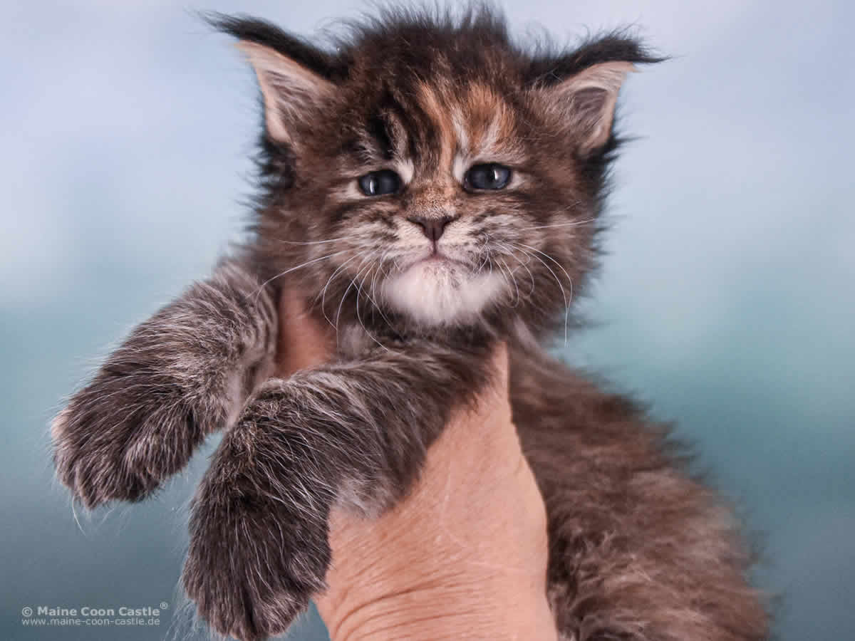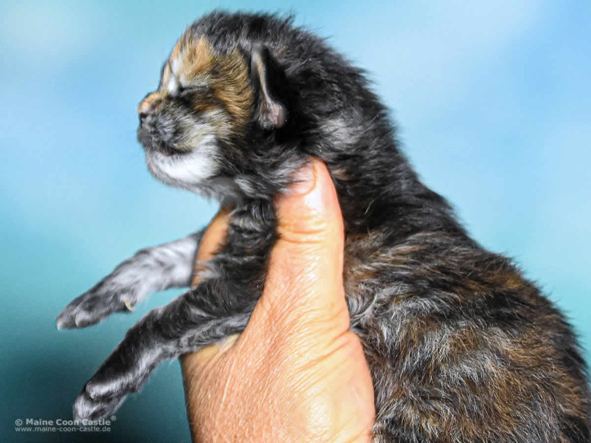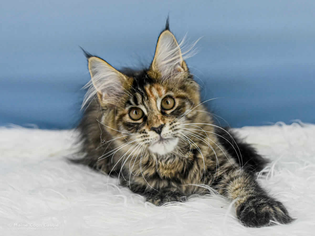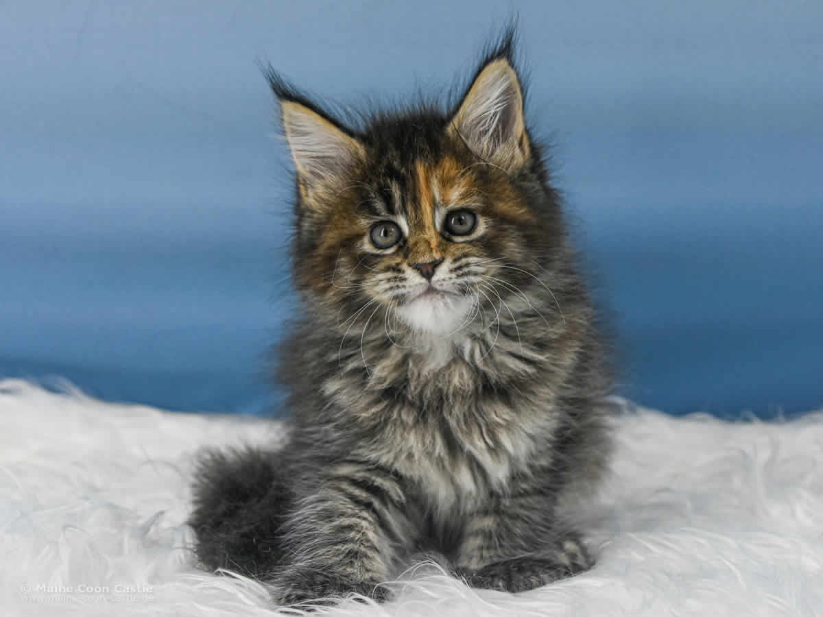 Das Maine Coon Baby spielt gern und ausdauernd. Bei gelegentlichen Raufereien ist sie nicht zimperlich und weiß sich durchzusetzen. Wie jedes Mädchen mit „buntem“ Fellkleid treibt sie mancherlei Unfug. Wenn das Mädel erwischt wird, dann entschuldigt sie sich mit einer unglaublich liebenswerten Charmeoffensive. Van Anett – Eine Maine Coon Katze fürs Herz.
