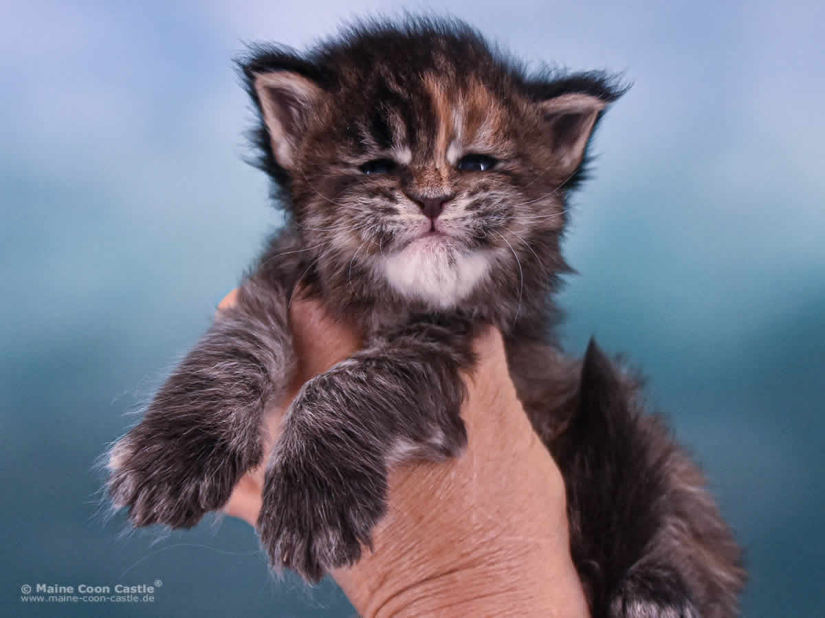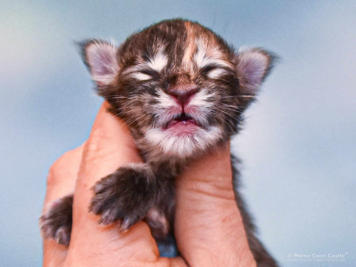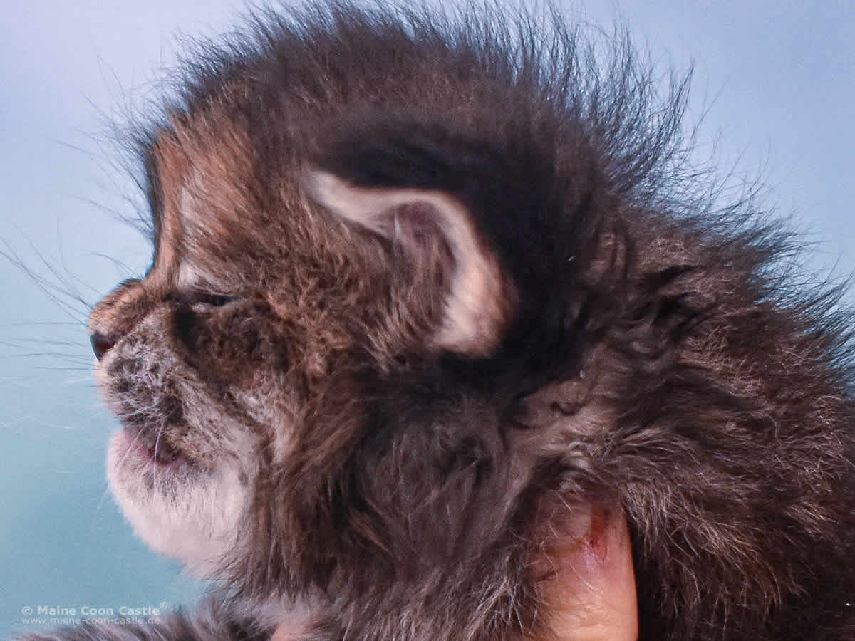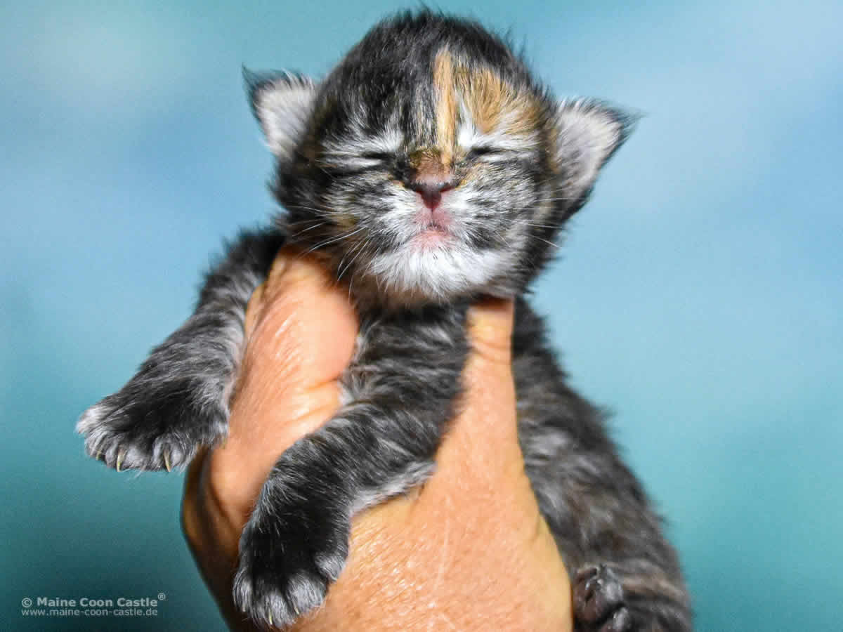 Das Maine Coon Baby spielt gern und ausdauernd. Bei gelegentlichen Raufereien ist sie nicht zimperlich und weiß sich durchzusetzen. Wie jedes Mädchen mit „buntem“ Fellkleid treibt sie mancherlei Unfug. Wenn das Mädel erwischt wird, dann entschuldigt sie sich mit einer unglaublich liebenswerten Charmeoffensive. Van Anett – Eine Maine Coon Katze fürs Herz.