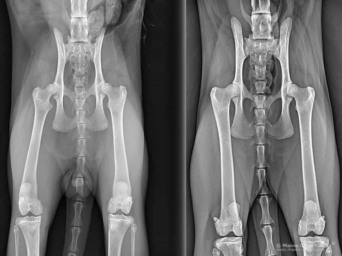 Aufgrund der Körpergröße und des zu erwartenden Gewichts bei einer Maine Coon ist die Belastung für den Knochenbau und dessen Gelenke extrem. Eine Hüftdysplasie ist in vielen Fällen bereits bei jungen Tieren durch ein zunehmend schlechter werdendes Gangbild zu erkennen. Das Röntgen der Hüften von Zuchtkatzen ist deshalb empfohlen.