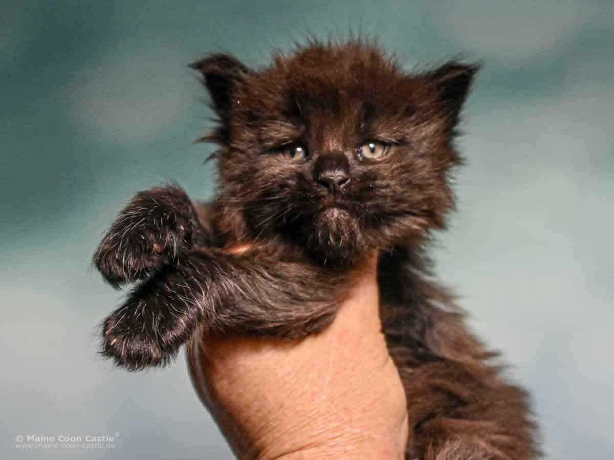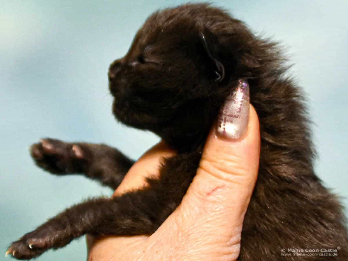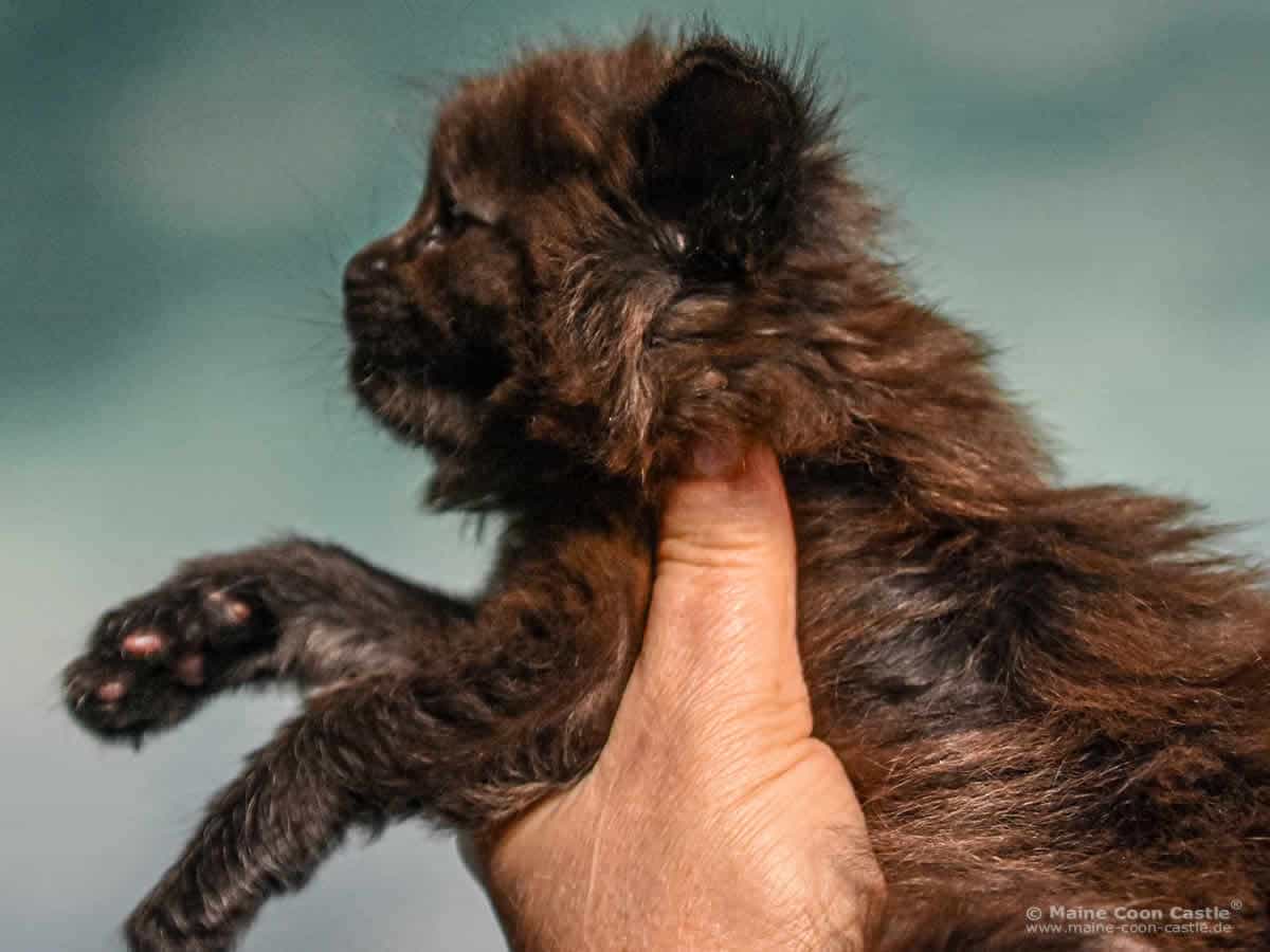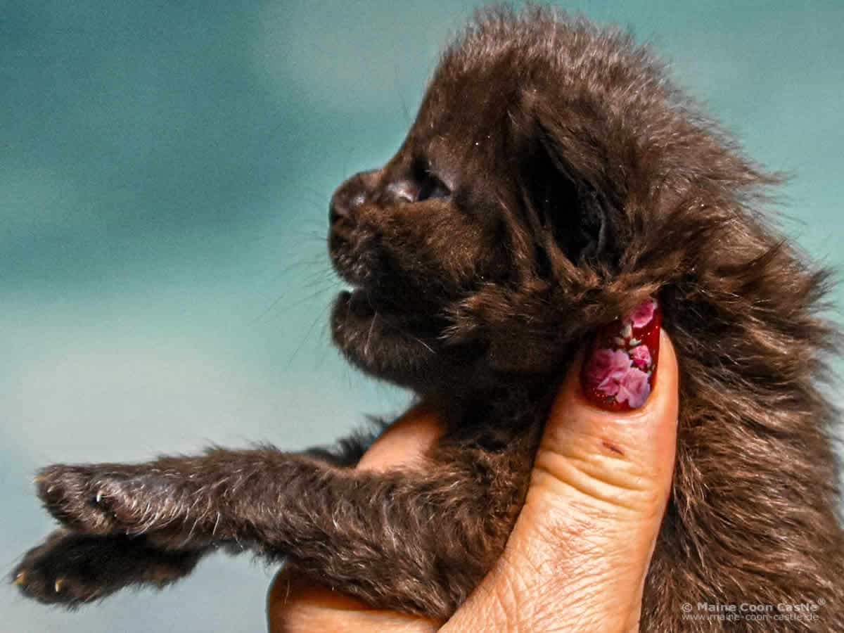 Das schwarze Maine Coon Kitten Nala of Maine Coon Castle ist die Prinzessin dieses Wurfes. Wenn sie sich beobachtet fühlt, dann flitzt das Maine Coon Katzenbaby nicht einfach mit den Geschwistern durch das Zimmer. Nala schreitet mit erhobenem Schwanz und wirft dem geneigten Betrachter majestätisch huldvolle Blicke zu. Bei der allabendlichen Leckerlirunde baut sich das Mädel fordernd vor mir auf und ich erahne, dass es eine Gnade ist, dass ich ihr die Leckereien reichen darf.
