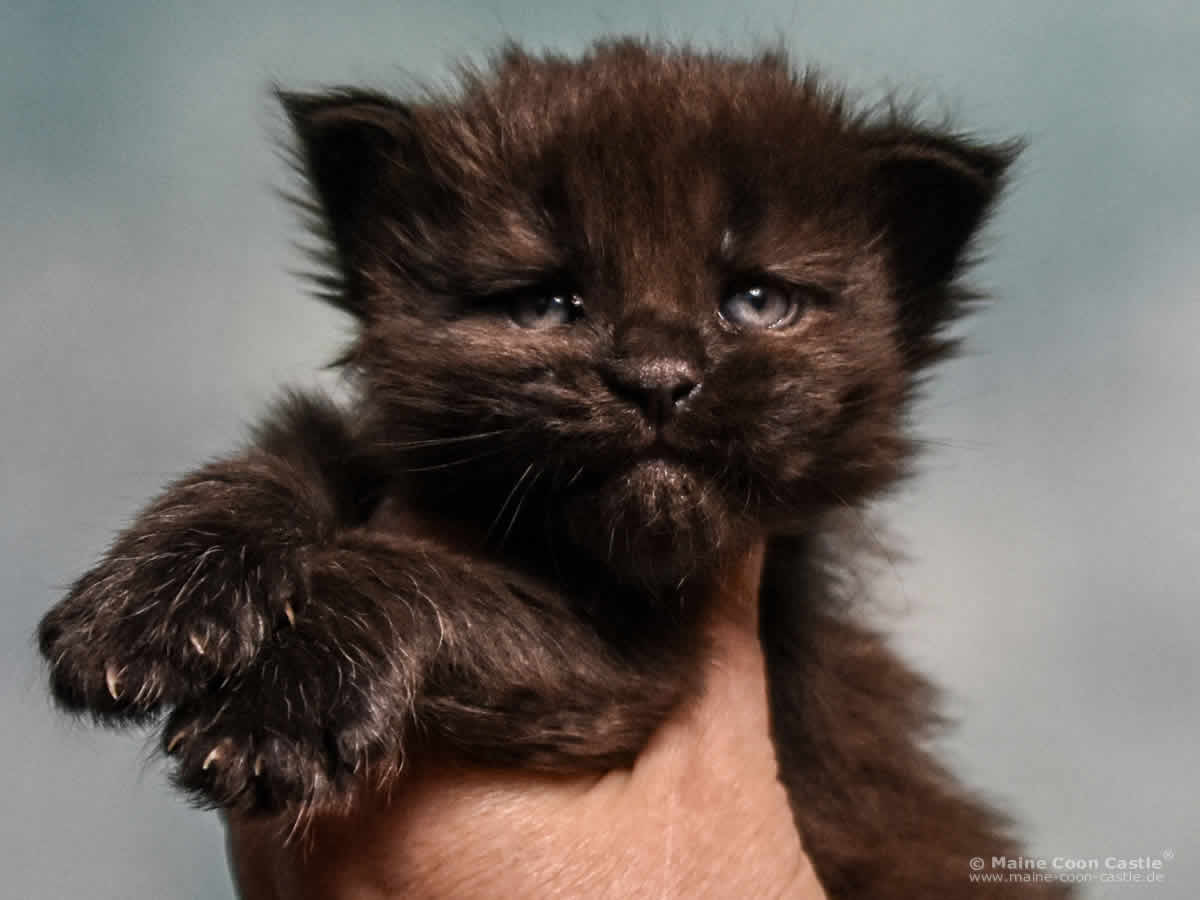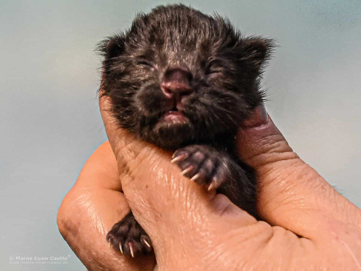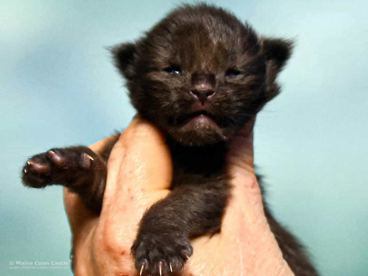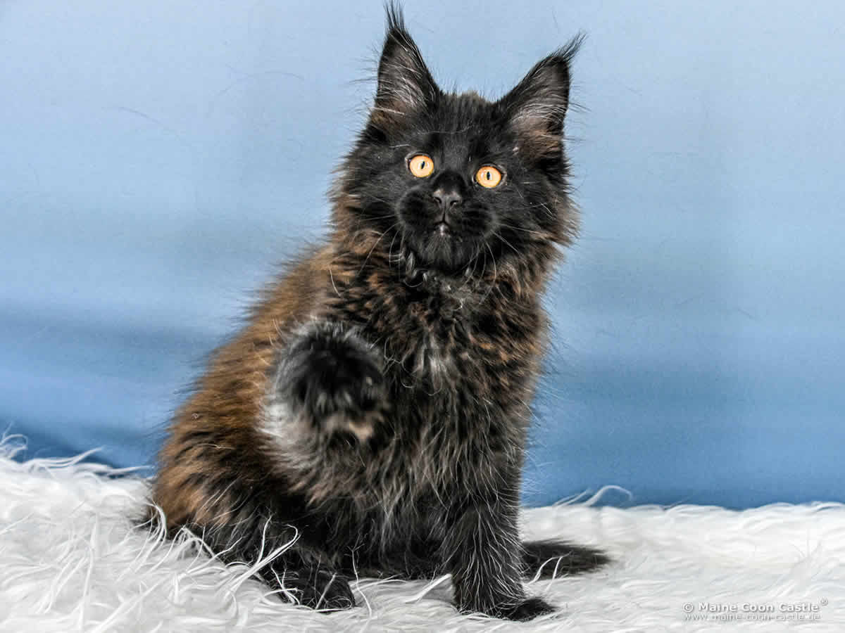 Das schwarze Maine Coon Kitten Nala of Maine Coon Castle ist die Prinzessin dieses Wurfes. Wenn sie sich beobachtet fühlt, dann flitzt das Maine Coon Katzenbaby nicht einfach mit den Geschwistern durch das Zimmer. Nala schreitet mit erhobenem Schwanz und wirft dem geneigten Betrachter majestätisch huldvolle Blicke zu. Bei der allabendlichen Leckerlirunde baut sich das Mädel fordernd vor mir auf und ich erahne, dass es eine Gnade ist, dass ich ihr die Leckereien reichen darf.