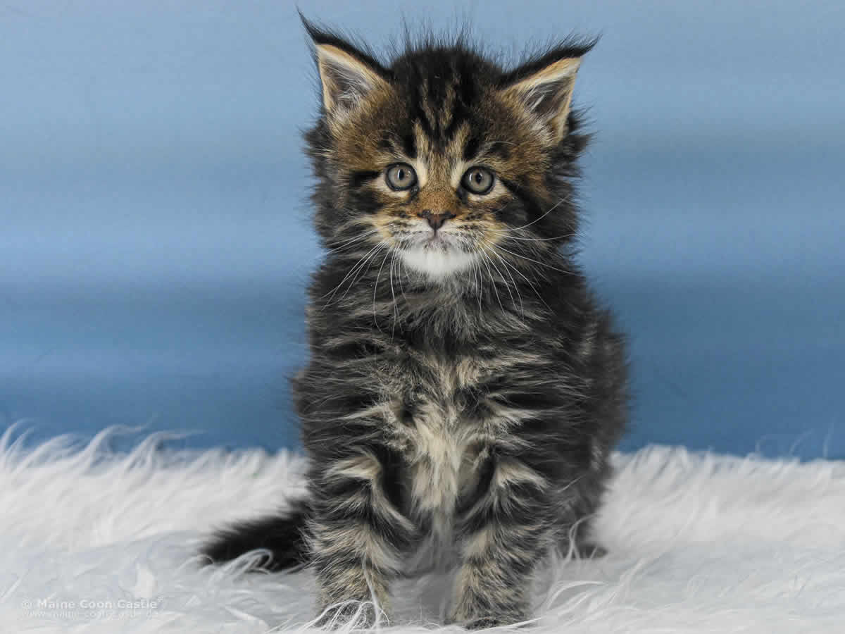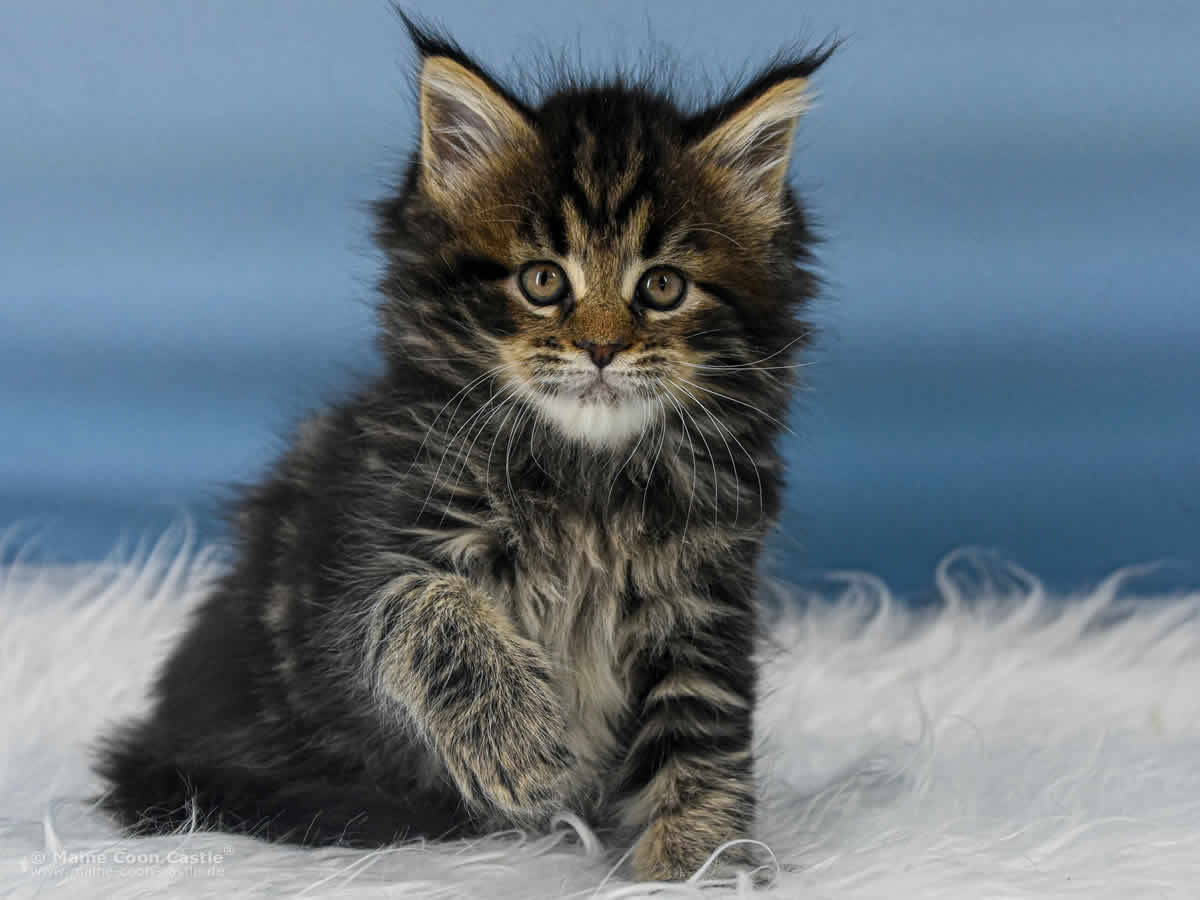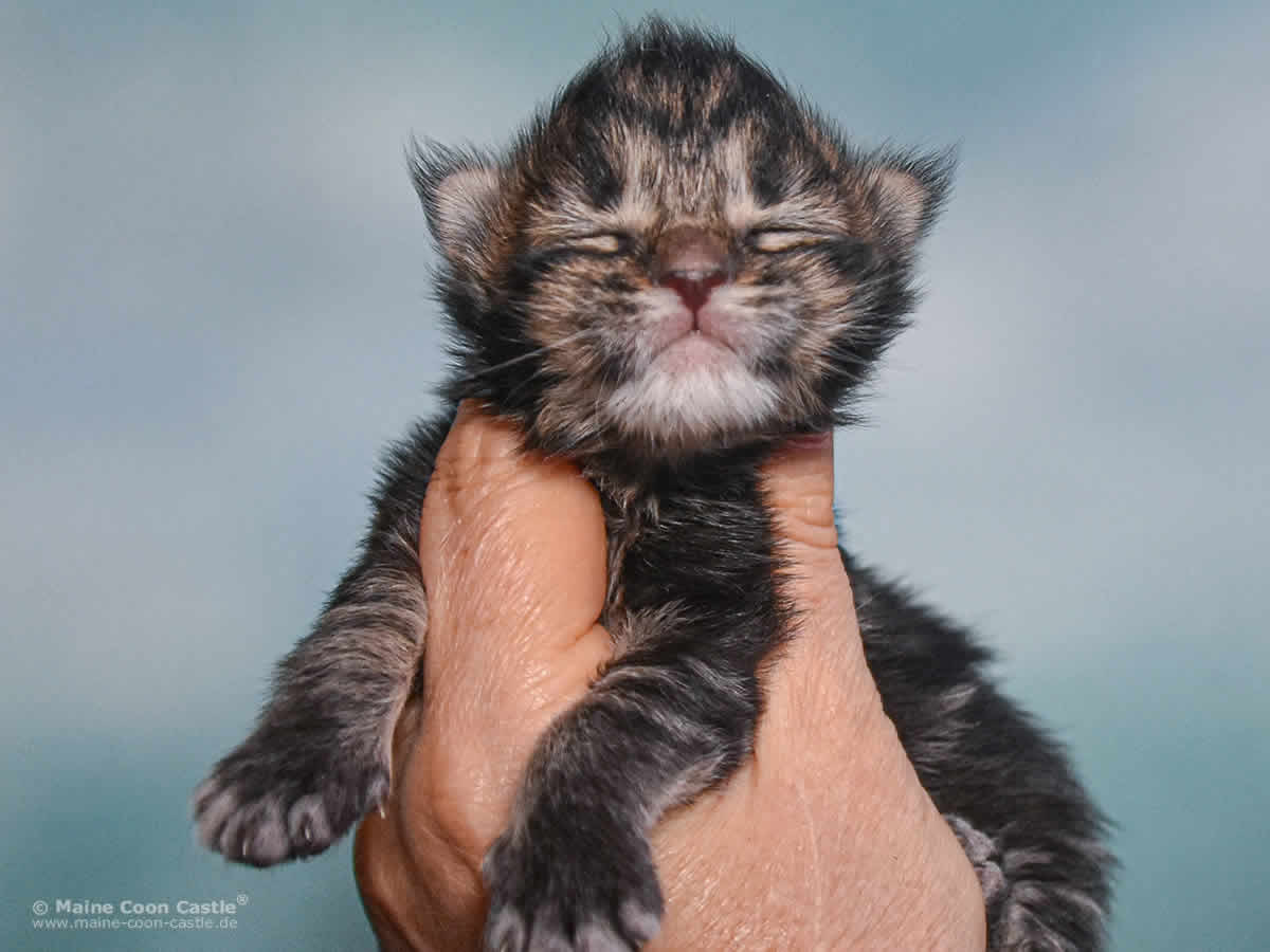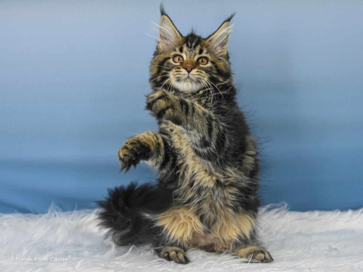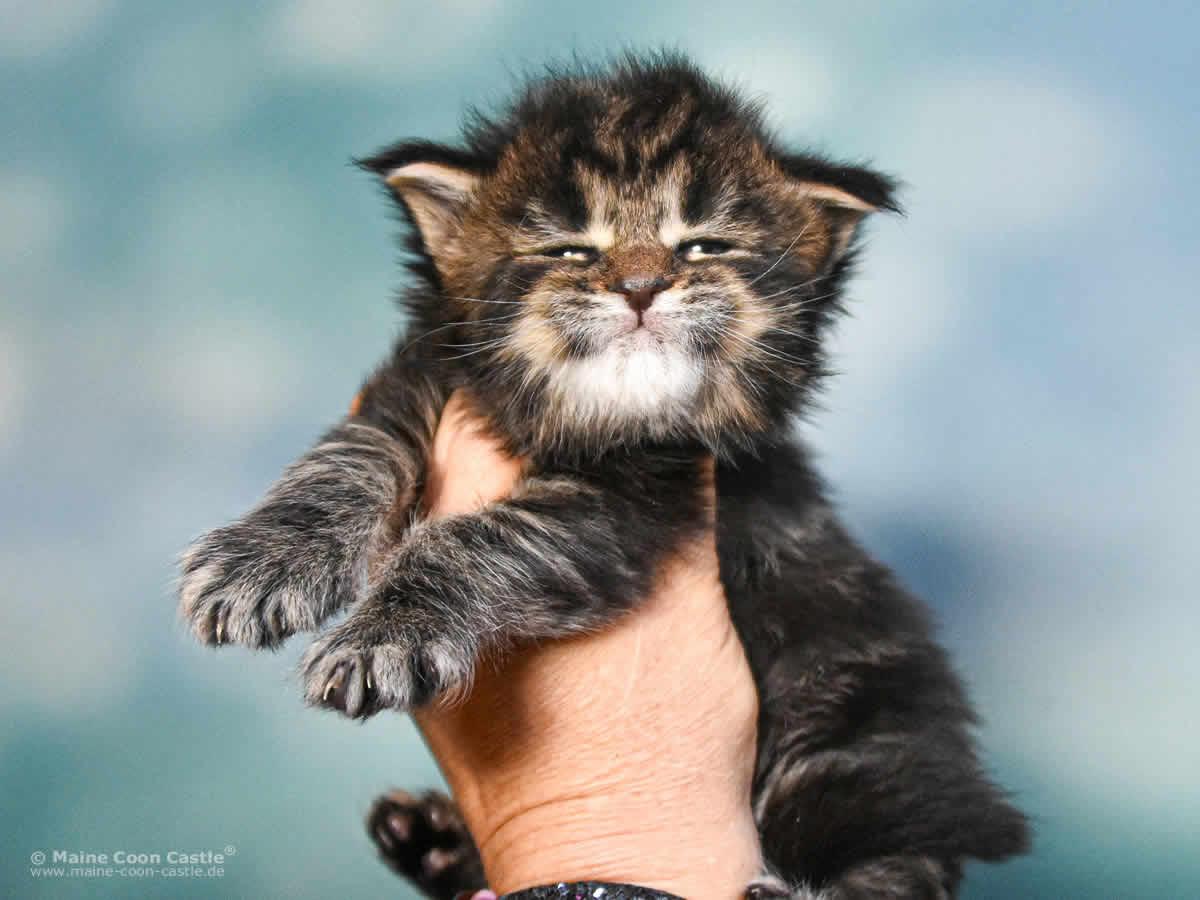 Das Maine Coon Kitten Tabby kann sich nicht entscheiden. Junge oder Mädel? Sie spielt wild und manchmal recht grob mit ihren Geschwistern. Mitunter wird sie zur Püppi und lässt sich von Toni verwöhnen. Tabby mag keinen Streit und geht spielerischen Auseinandersetzungen aus dem Weg. Streicheleinheiten honoriert Tabby mit lautem Schnurren.