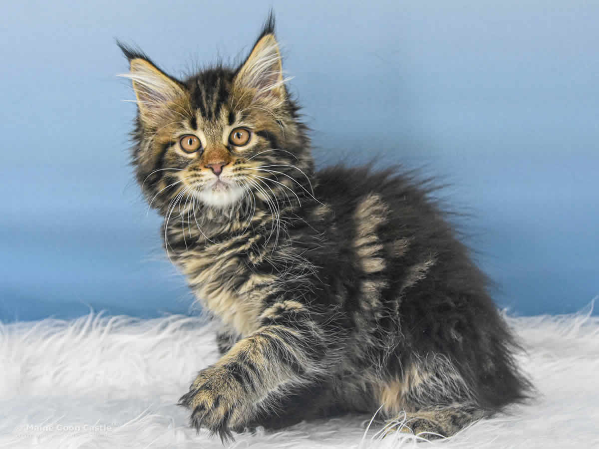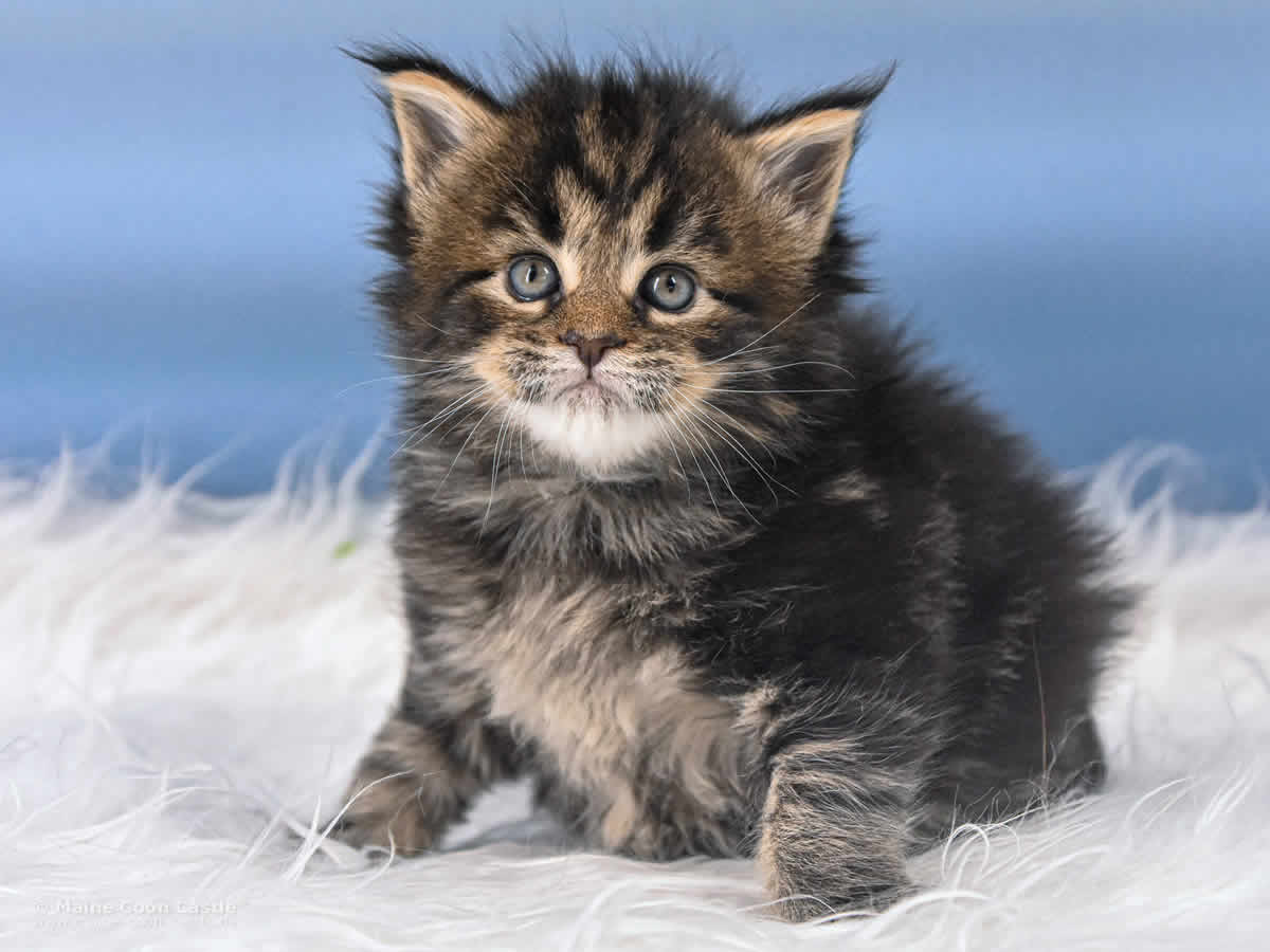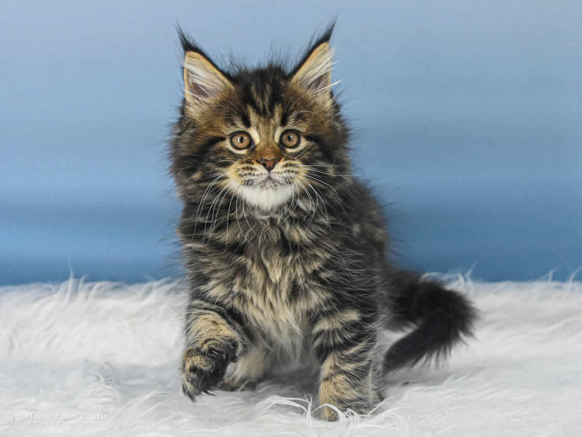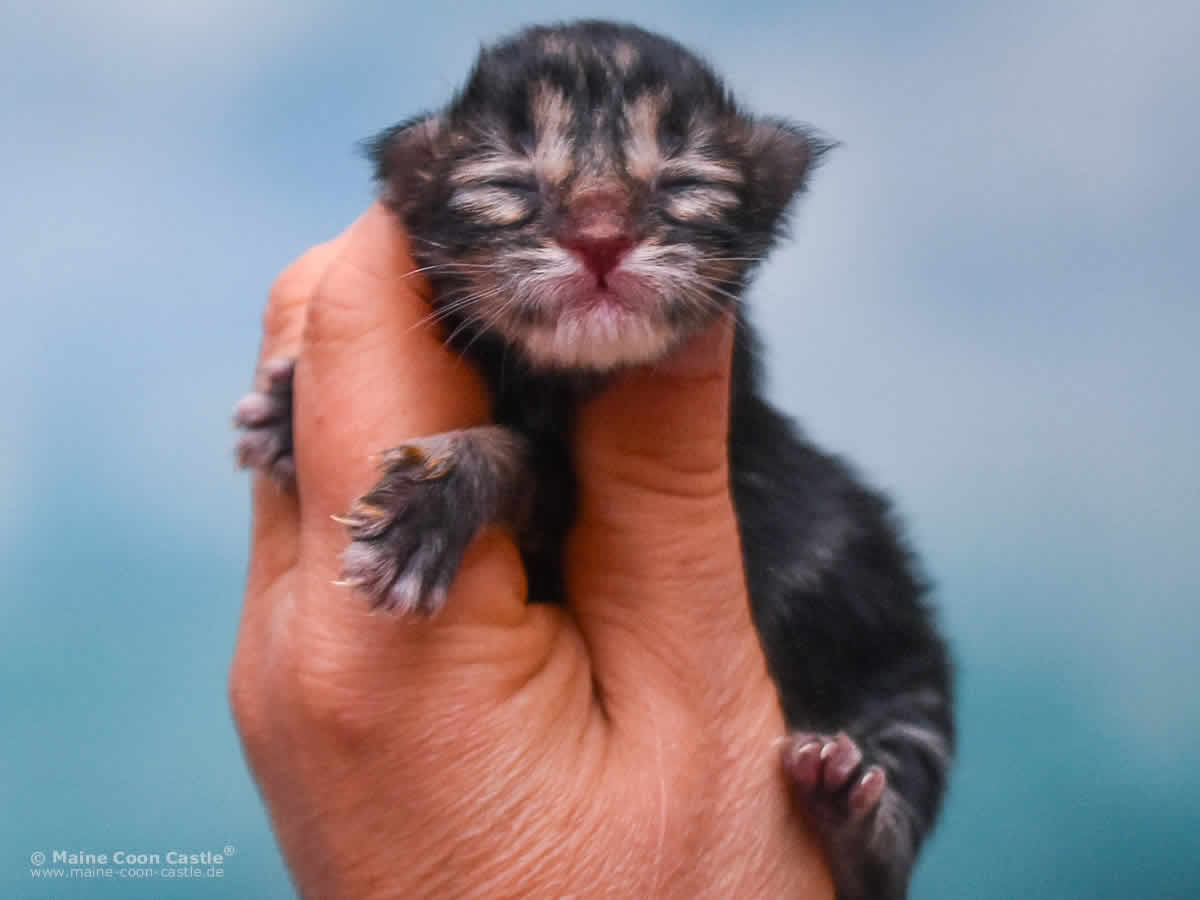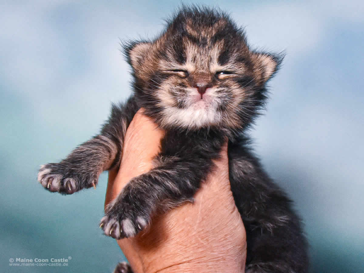 Das Maine Coon Kitten Tabby kann sich nicht entscheiden. Junge oder Mädel? Sie spielt wild und manchmal recht grob mit ihren Geschwistern. Mitunter wird sie zur Püppi und lässt sich von Toni verwöhnen. Tabby mag keinen Streit und geht spielerischen Auseinandersetzungen aus dem Weg. Streicheleinheiten honoriert Tabby mit lautem Schnurren.