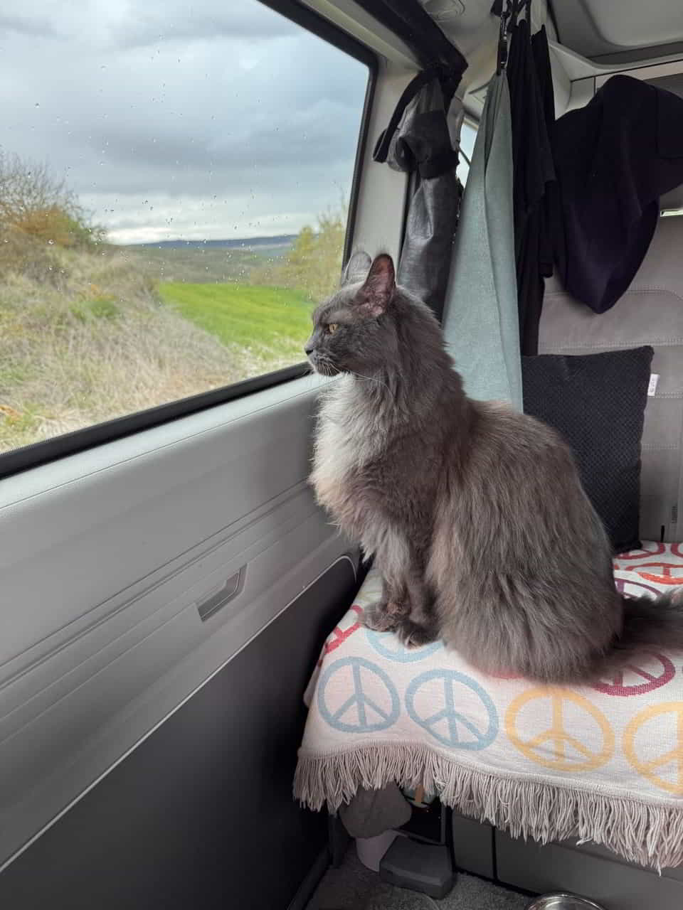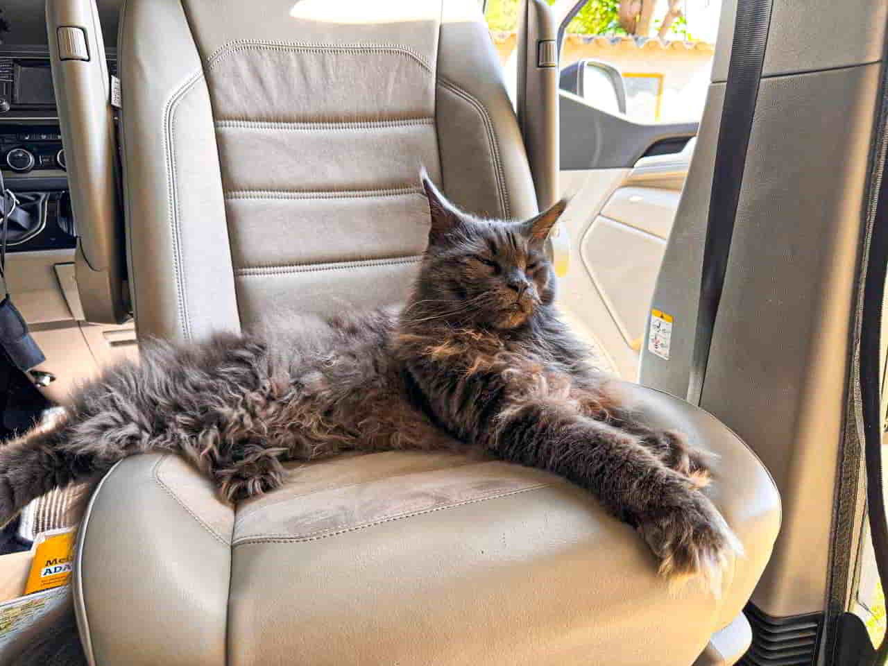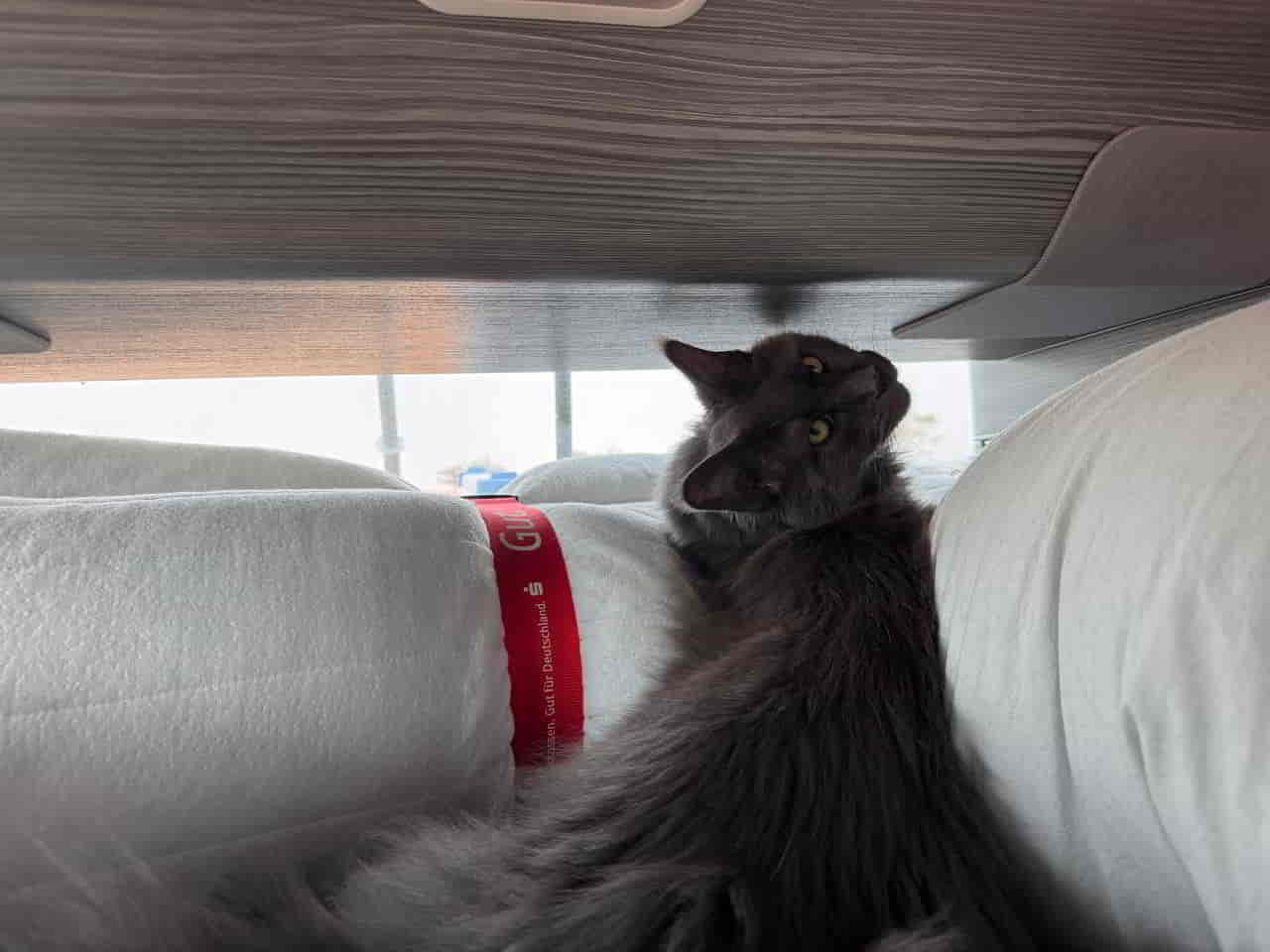 Aber gut – ich bin Mischa, fünf Jahre alt, ein Maine-Coon von stattlicher Eleganz, und seit fast einem Jahr bei Natalia und Jürgen. Sie meinen es gut. Und sie wissen mittlerweile auch, dass ich mich während der Fahrt am liebsten nicht bewegen möchte. Mein Thron – pardon, Nest – hinter der Rückbank, eingerahmt von Schlafsäcken, ist meine Festung. Dort liege ich. Dort verharre ich. Und dort beobachte ich, mit halb geschlossenen Augen, wie das Leben draußen an mir vorbeizieht. Kilometer für Kilometer. Windschutzscheiben-Netflix, quasi.