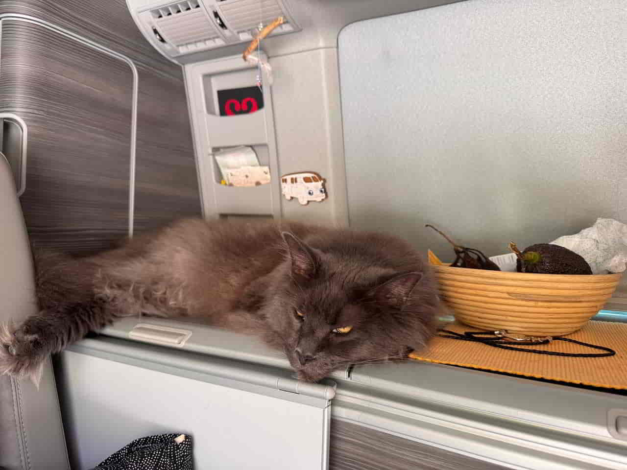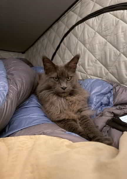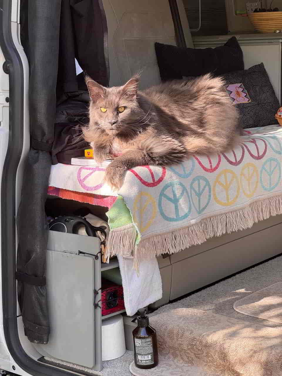 Aber gut – ich bin Mischa, fünf Jahre alt, ein Maine-Coon von stattlicher Eleganz, und seit fast einem Jahr bei Natalia und Jürgen. Sie meinen es gut. Und sie wissen mittlerweile auch, dass ich mich während der Fahrt am liebsten nicht bewegen möchte. Mein Thron – pardon, Nest – hinter der Rückbank, eingerahmt von Schlafsäcken, ist meine Festung. Dort liege ich. Dort verharre ich. Und dort beobachte ich, mit halb geschlossenen Augen, wie das Leben draußen an mir vorbeizieht. Kilometer für Kilometer. Windschutzscheiben-Netflix, quasi.