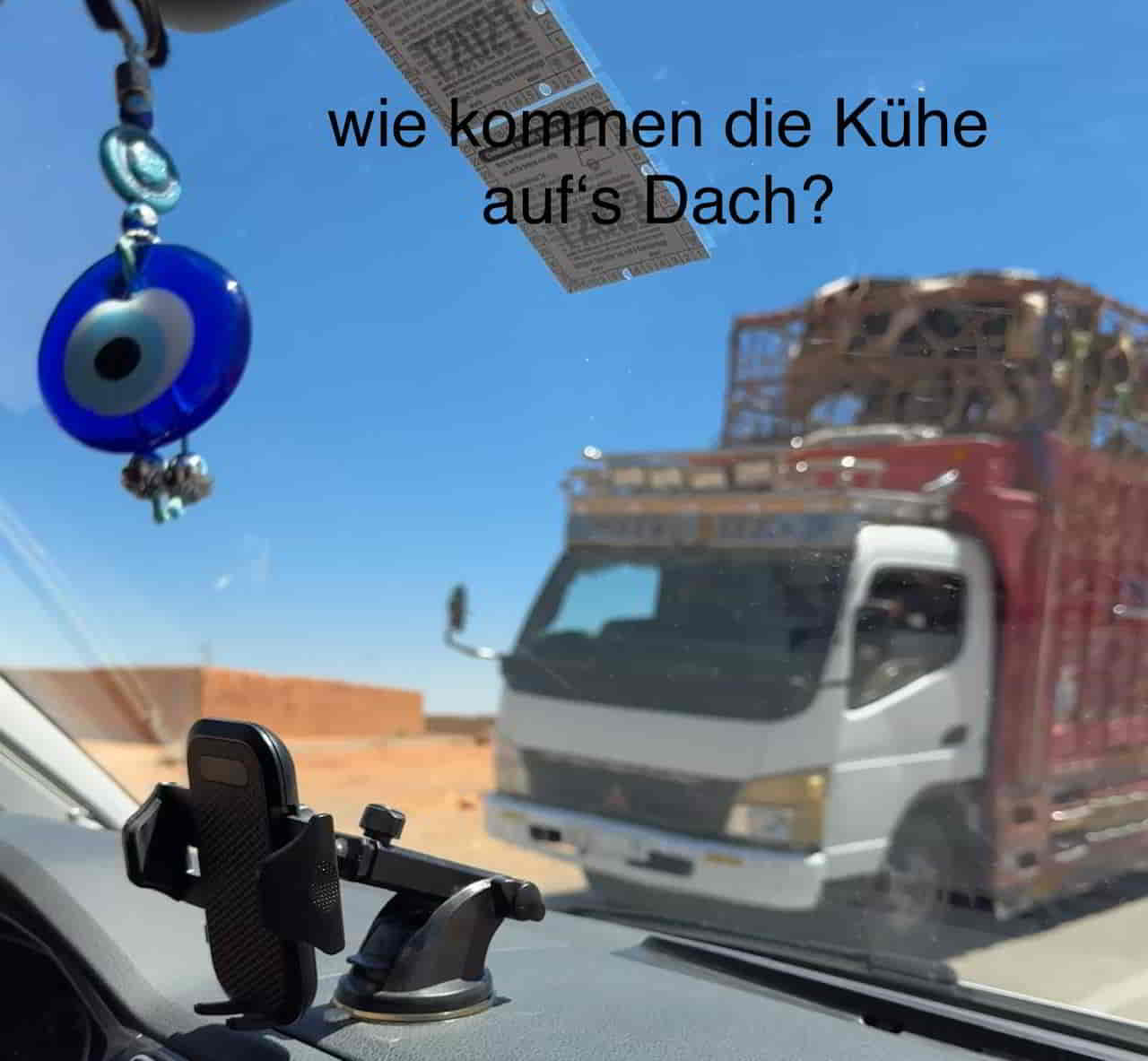 Mal eben in die Wüste fahren … Dass ich nicht lache! Es dauert ewig. Und es wird mit jedem Kilometer wärmer. Zum Glück haben wir ne Klimaanlage an Bord und ich bekomme konstant 21 Grad zugefechert.