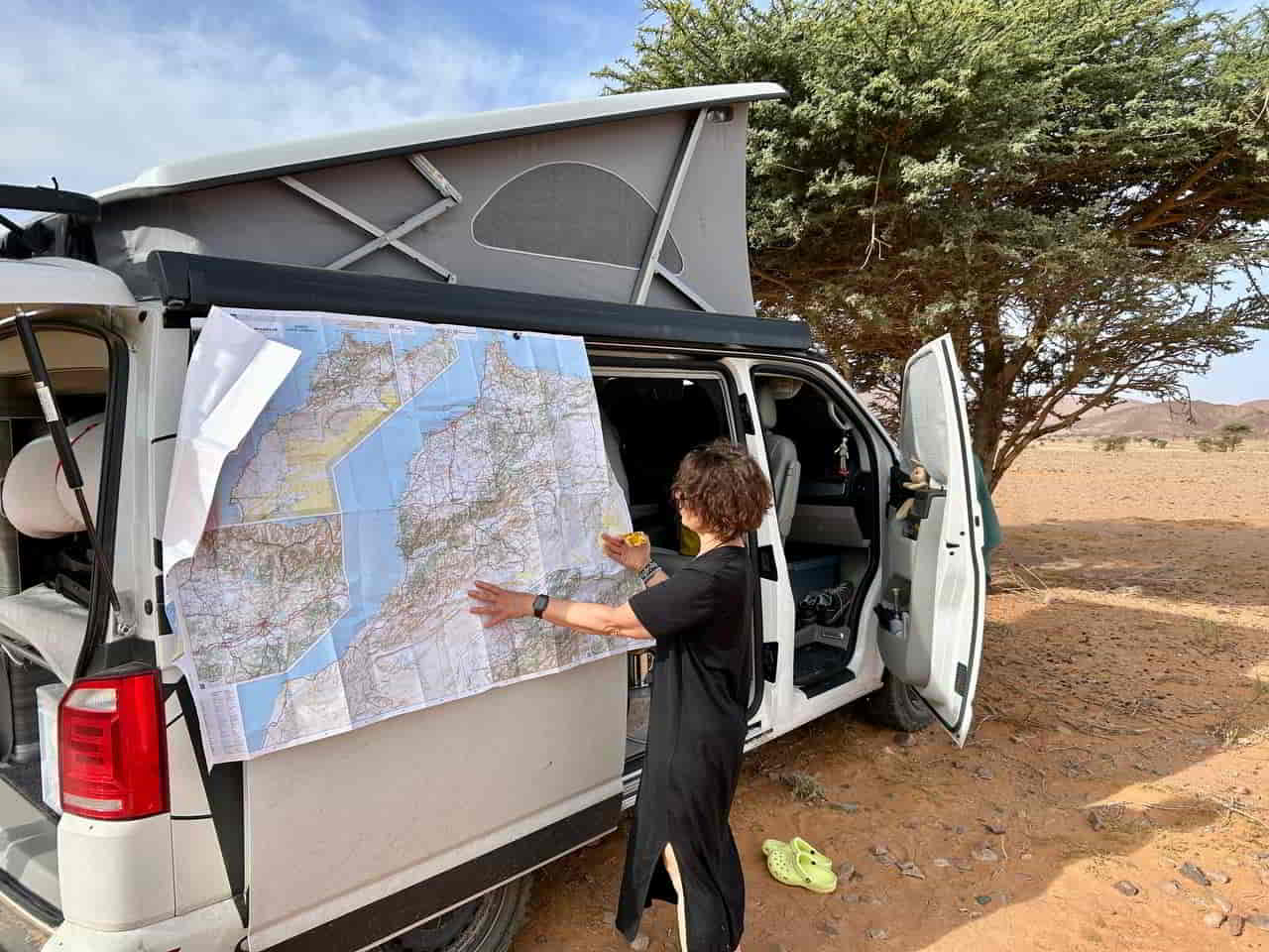 Abends landen wir auf einem Campingplatz. Keine mehrtägige Wüstentour. Stattdessen: Entscheidung am Straßenrand, per Landkarte an der Bulli-Scheibe.