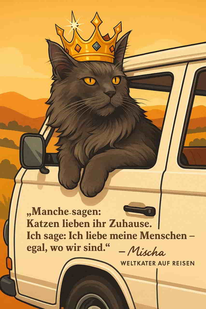 Ich bin Reise-Mischa. Ein Weltenkater. Ein Abenteurer mit Fell. Und jetzt entschuldigt mich – ich habe einen Nap zu halten, bevor wir Richtung Algeciras weiterrollen. Und da soll es dann auf eine Fähre gehen. Wasser. Schaukeln. Ich sag’s mal so: Wenn da nicht ein Thunfischbuffet auf mich wartet, bin ich raus.