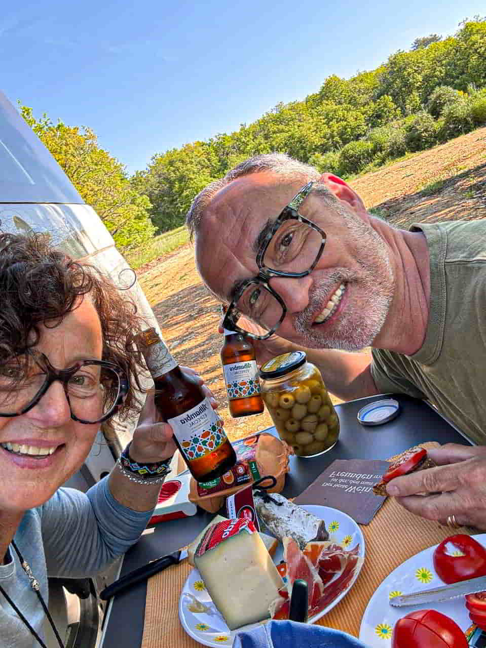 Die Fahrt ging weiter – durch Hügel, Gebirge, vorbei an Olivenbäumen. Irgendwann holperte es ordentlich, bis wir den Nachtplatz erreichten. Es stürmte heftig, das Dachzelt wackelte, der Bus bebte. Ich habe gut geschlafen. Quer am Kopfende, wie immer. Nähe ist alles, wenn die Welt da draußen verrückt spielt.